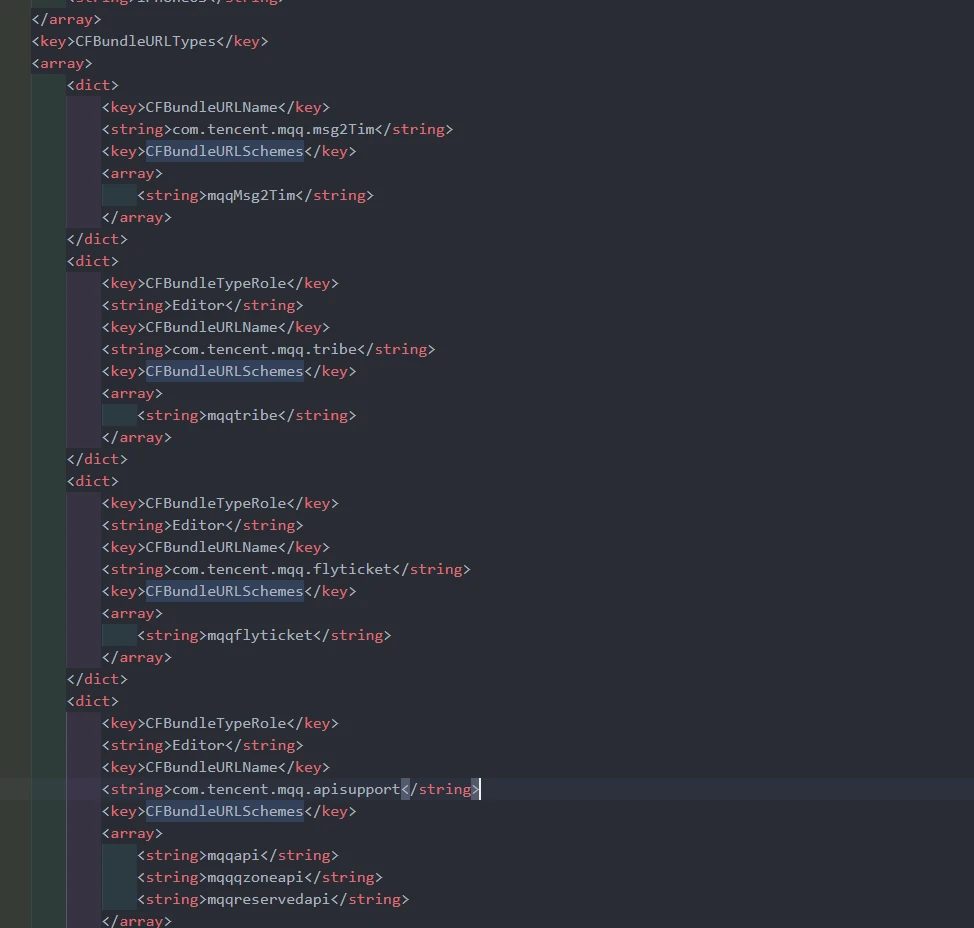 | <key>CFBundleURLName</key> <string>com.tencent.mqq.msg2Tim</string> # 这个也可以用 <key>CFBundleURLSchemes</key> <array> <string>mqqMsg2Tim</string> </array> </dict> <dict> <key>CFBundleTypeRole</key> <string>Editor</string> <key>CFBundleURLName</key> <string>com.tencent.mqq.tribe</string> # 这个也可以用 <key>CFBundleURLSchemes</key> <array> <string>mqqtribe</string> # 这个也可以用 </array> </dict> <dict> <key>CFBundleTypeRole</key> <string>Editor</string> <key>CFBundleURLName</key> <string>com.tencent.mqq.flyticket</string> # 这个也可以用 <key>CFBundleURLSchemes</key> <array> <string>mqqflyticket</string> # 这个也可以用 </array> </dict>
